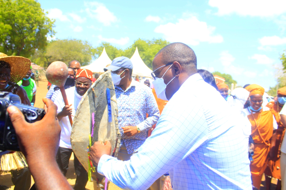Eric Mugo being handed the shield to defend the minorities of lamu county .